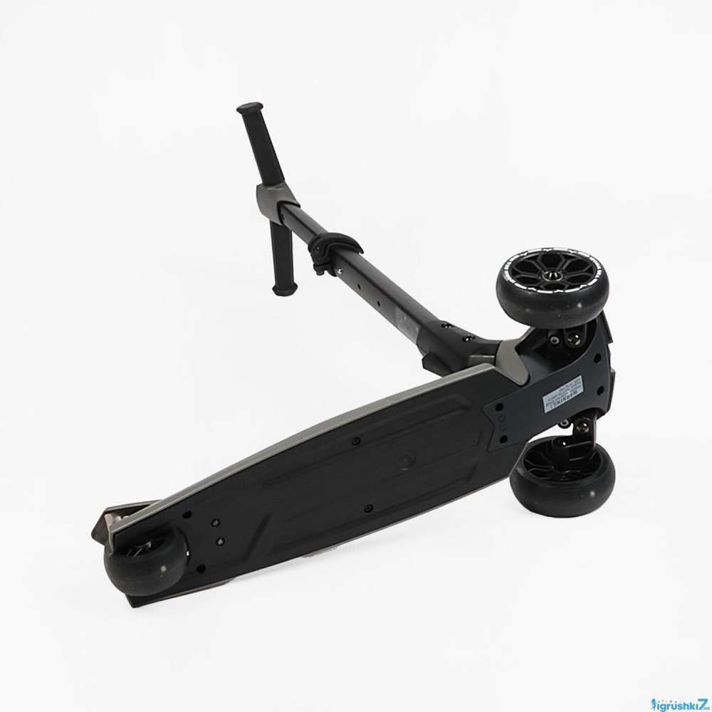 Самокат оснащений складним алюмінієвим кермом, яке регулюється по висоті та підлаштовується під зріст дитини. Три PU-колеса мають LED-підсвітку, світяться під час руху й забезпечують плавний хід.
